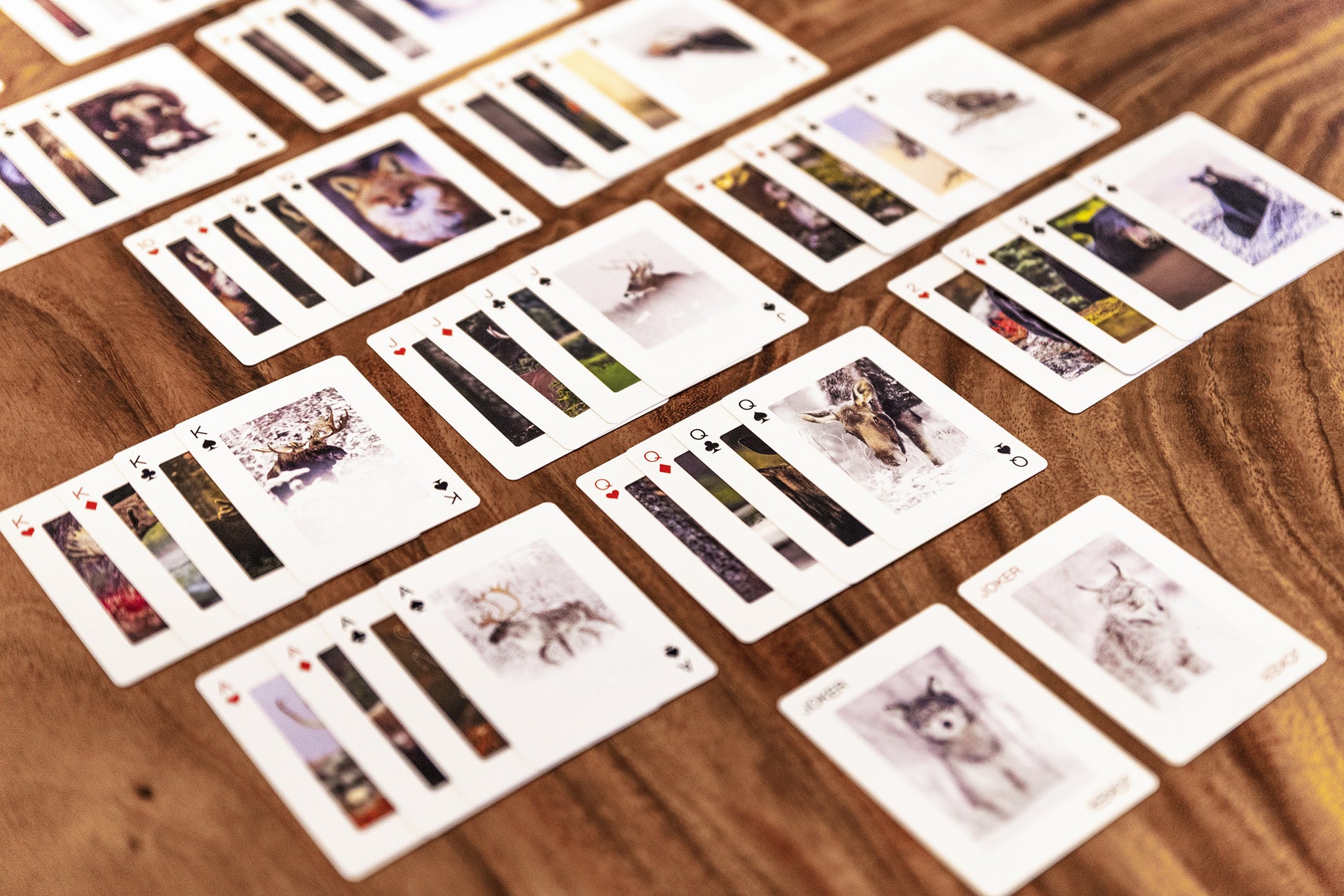 Le jeu de cartes contient 57 images uniques parmi lesquelles on retrouve 52 cartes à jouer, 2 cartes de références des 35 espèces présentées, 2 jokers et une carte de présentation de l'artiste.